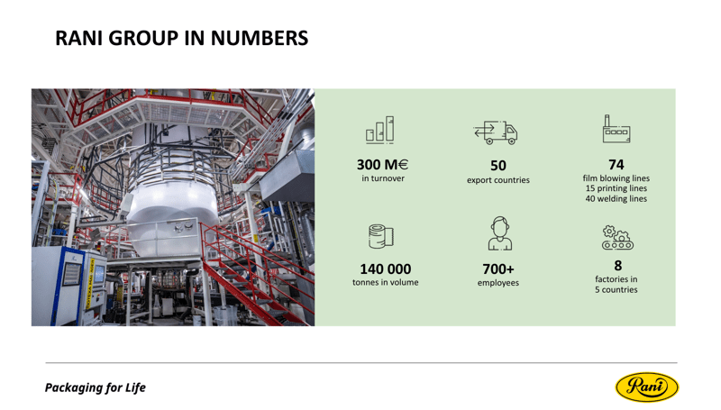 Perheyhtiö Rani Plast on Pohjoismaiden johtavia kestävien pakkausratkaisujen toimittajia. Juuremme ovat tukevasti Teerijärvellä, ja tuotteitamme viedään yli 50 maahan. Meillä on noin 400 työntekijää Suomessa ja kahdeksan tehdasta viidessä eri maassa, ja liikevaihtomme on noin 300 miljoonaa euroa.