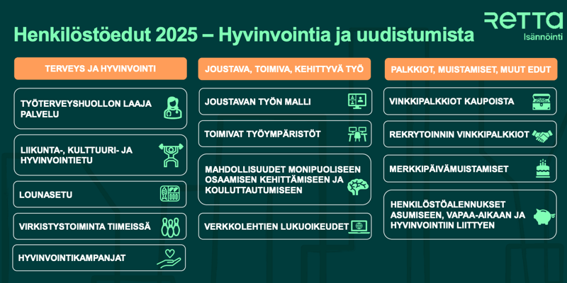 Työhyvinvointipanostukset – Uusia henkilöstöetuja (mm. työsuhdepyörä), laajennettu työterveys, hyvinvointiohjelmat ja tiimitapahtumat.