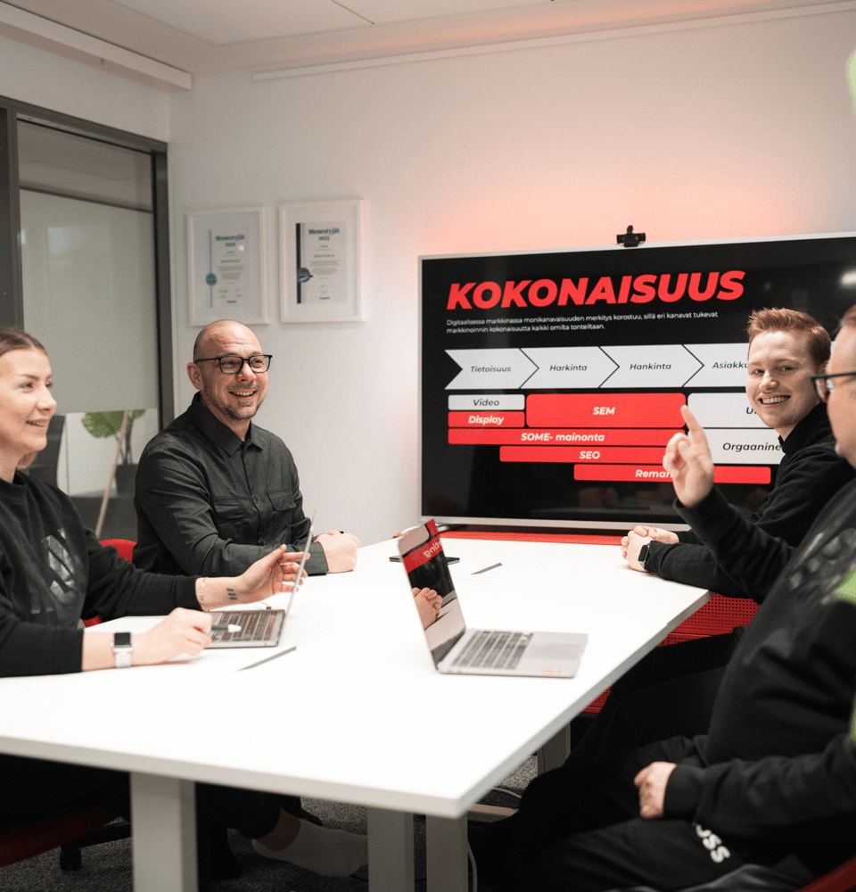 Mutta me emme ole vain mainonnan, analytiikan ja sisällöntuotannon osaajia. Olemme persoonia, jotka uskaltavat ajatella isosti, nauraa reilusti ja tukea toisiamme tilanteessa kuin tilanteessa. Meillä tiimityö on enemmän kuin työ – se on yhteispeliä, jossa jokainen saa loistaa omalla tavallaan.