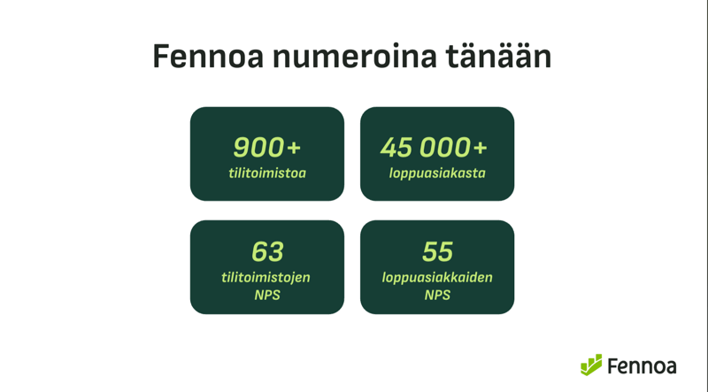 - Fennoan erinomaisen tuotteen takana voi asiakas roolissa aidosti seisoa ylpeänä: NPS on 63, asiakas poistuma mitätön, ja arvojen mukaisesti "tuote on tekemisen keskiössä"