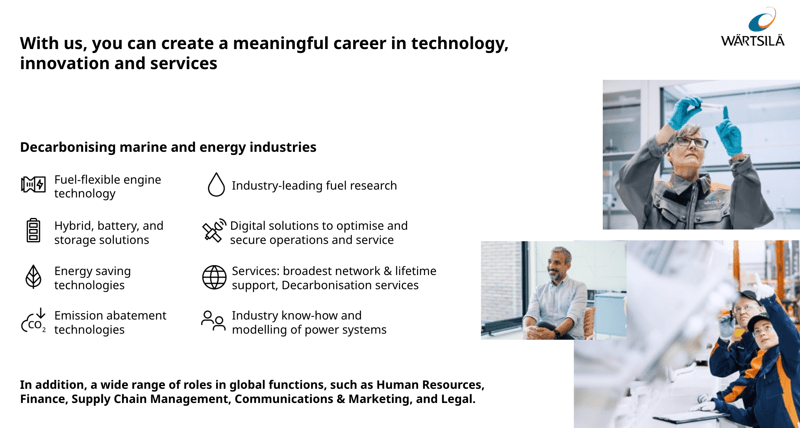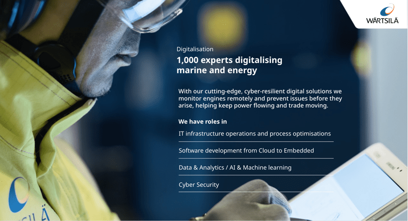 The position is located at Wärtsilä’s locations either in Salmisaari, Helsinki, or in Vaasa. Wärtsilä operates in a hybrid work model. The role reports directly to Wärtsilä’s Chief Information Officer, Tuomas Salosaari, as a member of his leadership team.